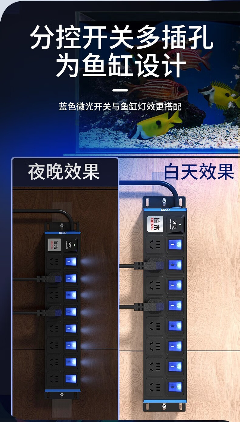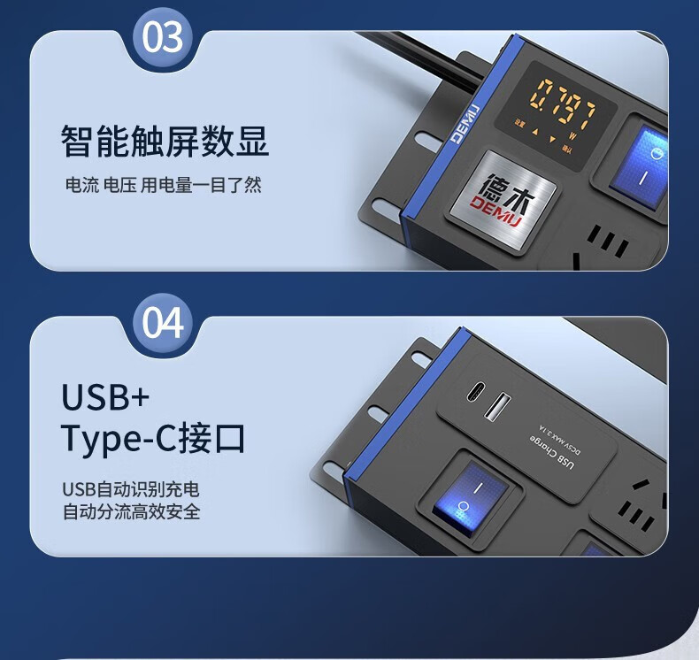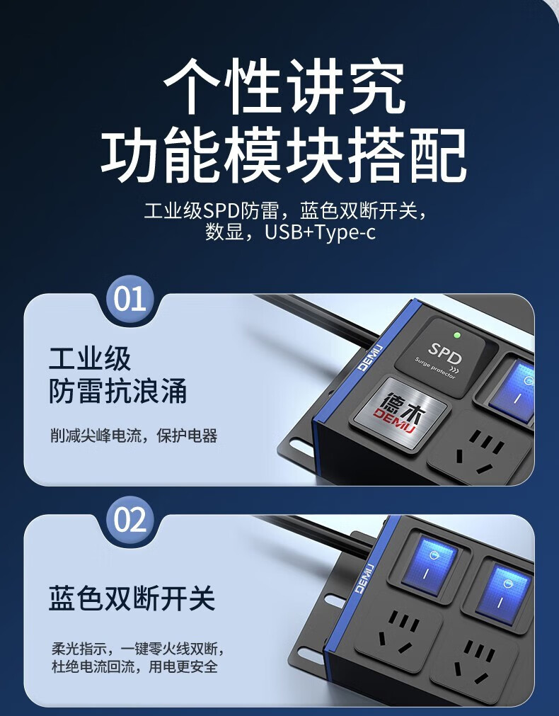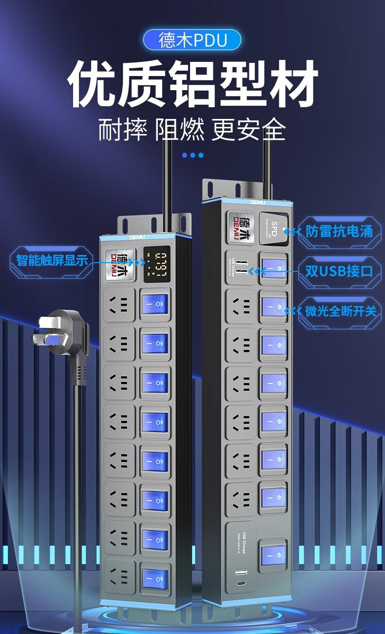德木(DEMU)pdu插排桌面插排电竞插座防雷分控排插USB独立开关机柜插排免打孔安装 分控 10插位 1.5平2米线