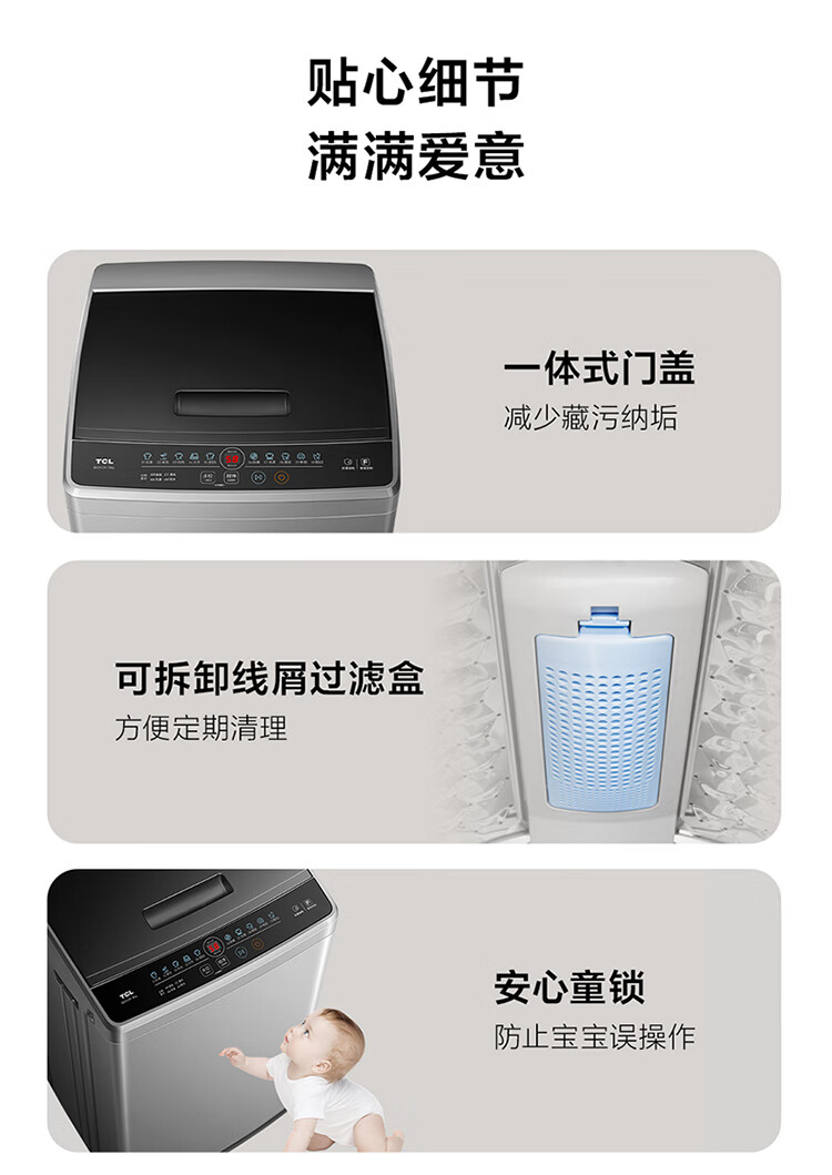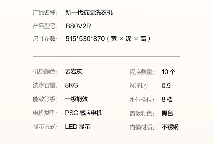 TCL 8KG波轮洗衣机V2R全自动一级能效 一键脱水中途添衣家用租房公寓用大容量洗衣机 【8公斤 云岩灰】抗菌除螨B80V2R