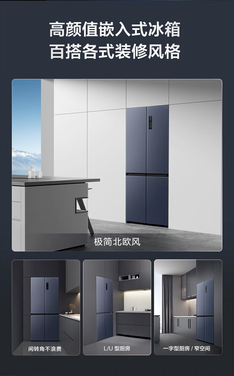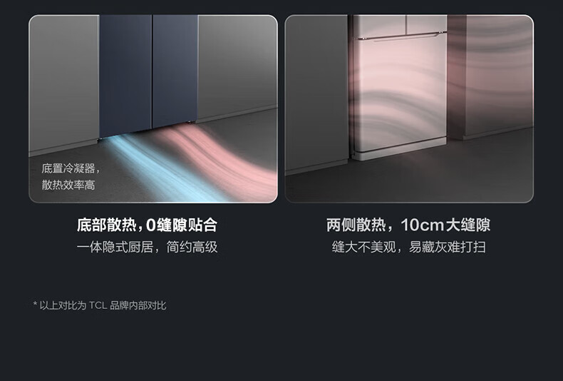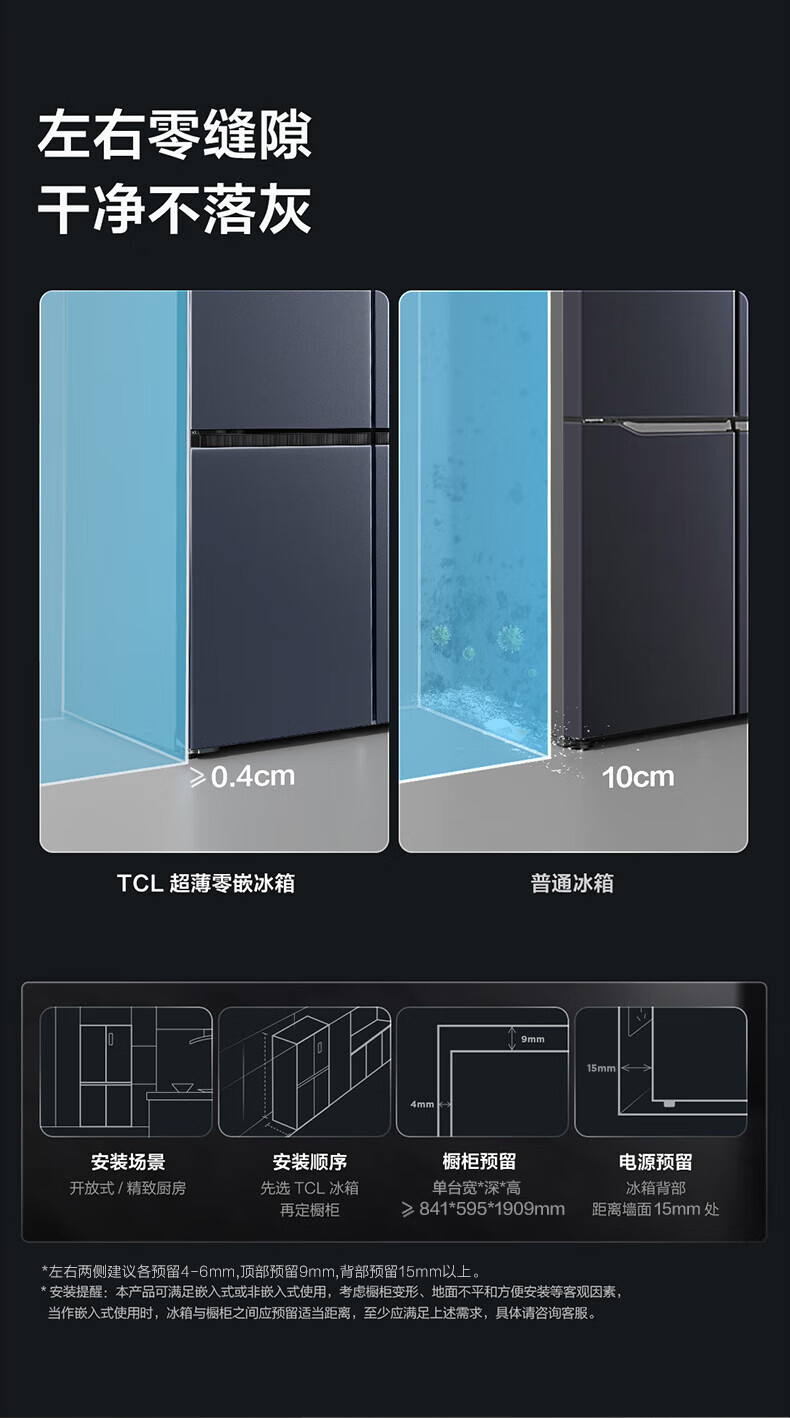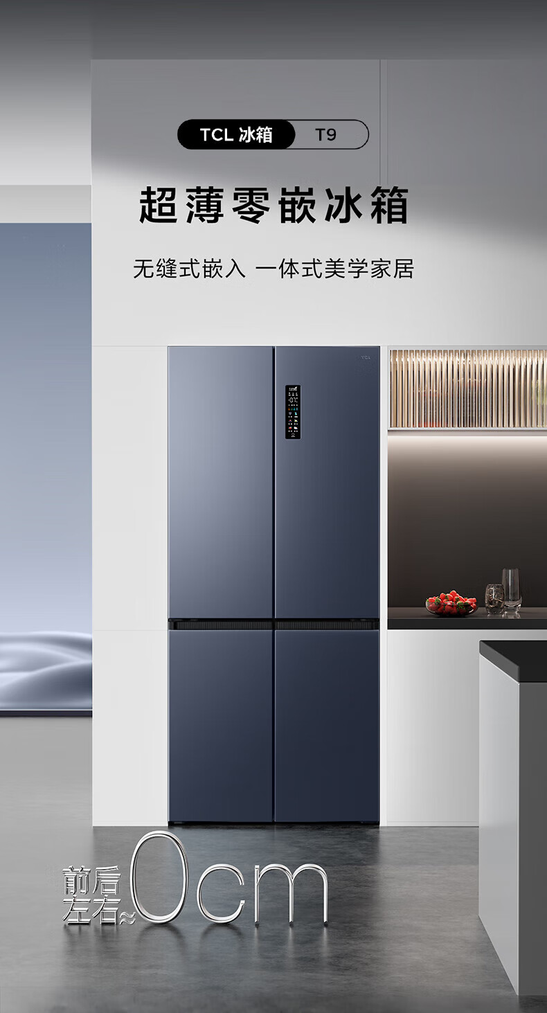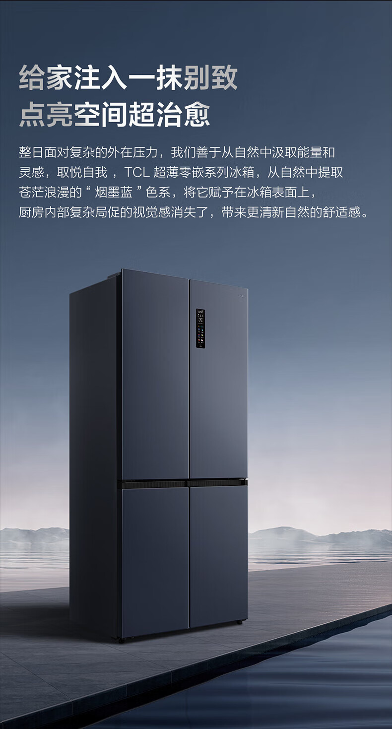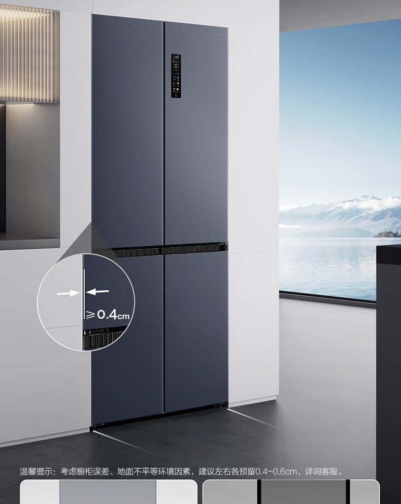 TCL对开门60/70/75/83厘米宽十字四门412升58cm深一级风冷零嵌入冰箱 405升 灰1.76米高70宽 一级风冷 两侧散热