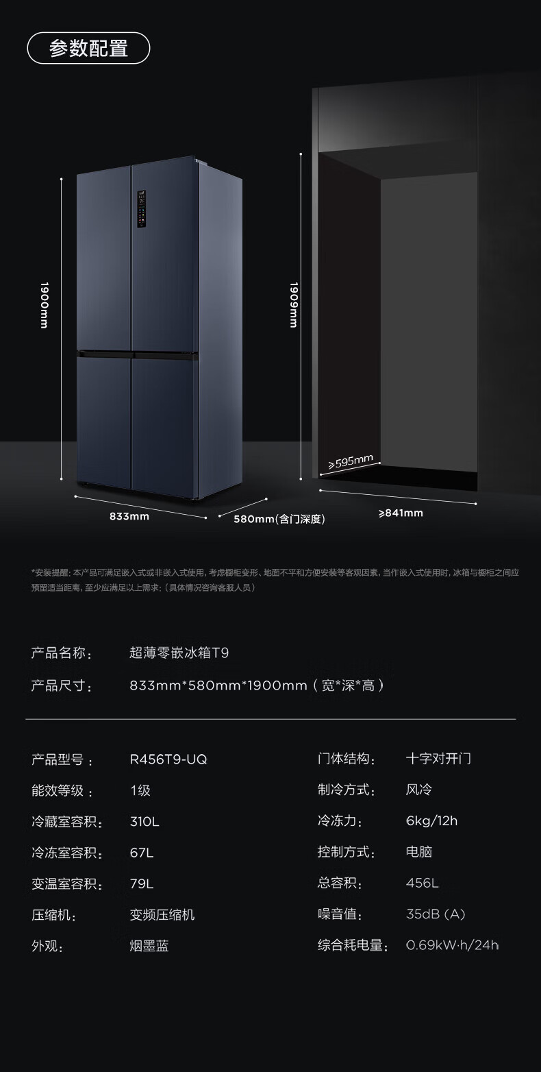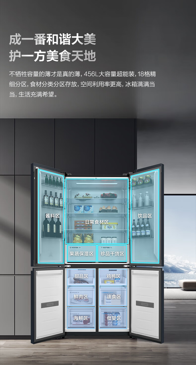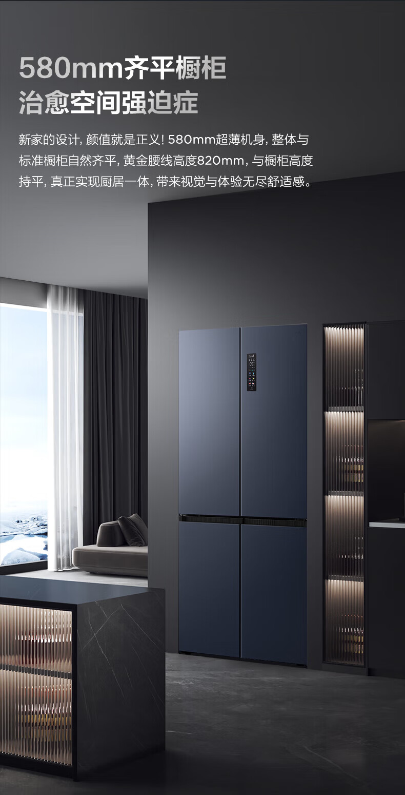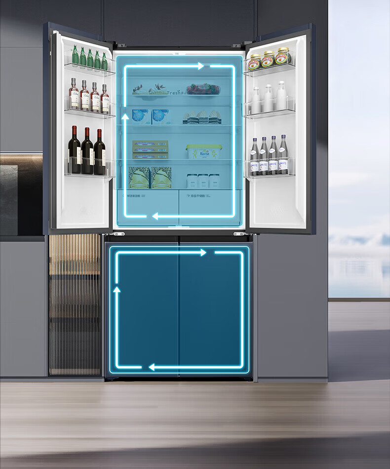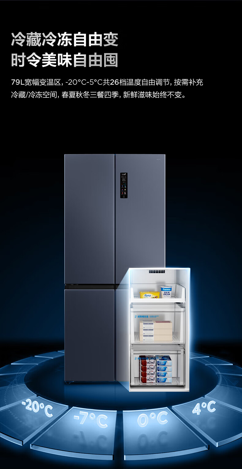 TCL对开门60/70/75/83厘米宽十字四门412升58cm深一级风冷零嵌入冰箱 405升 灰1.76米高70宽 一级风冷 两侧散热